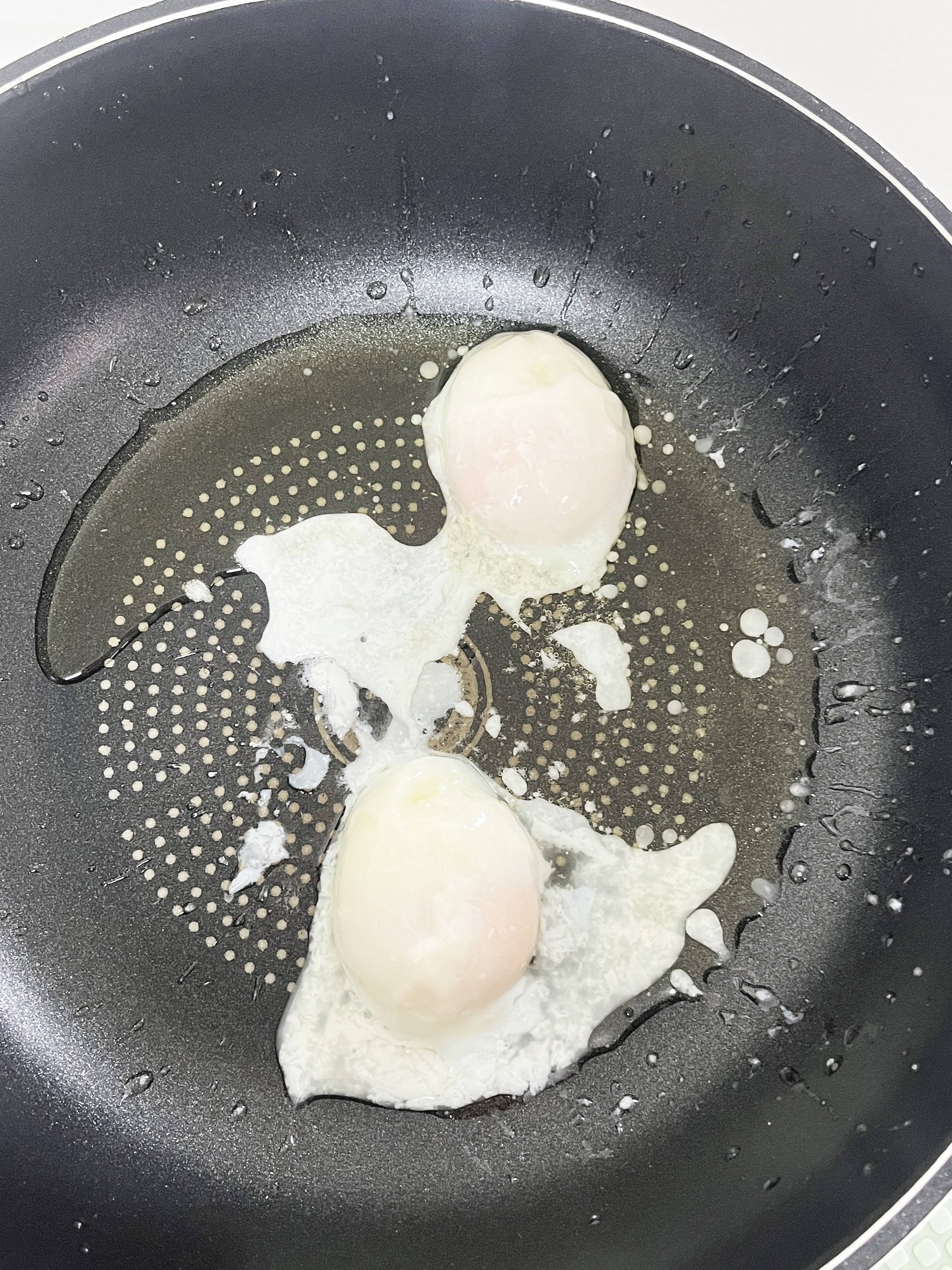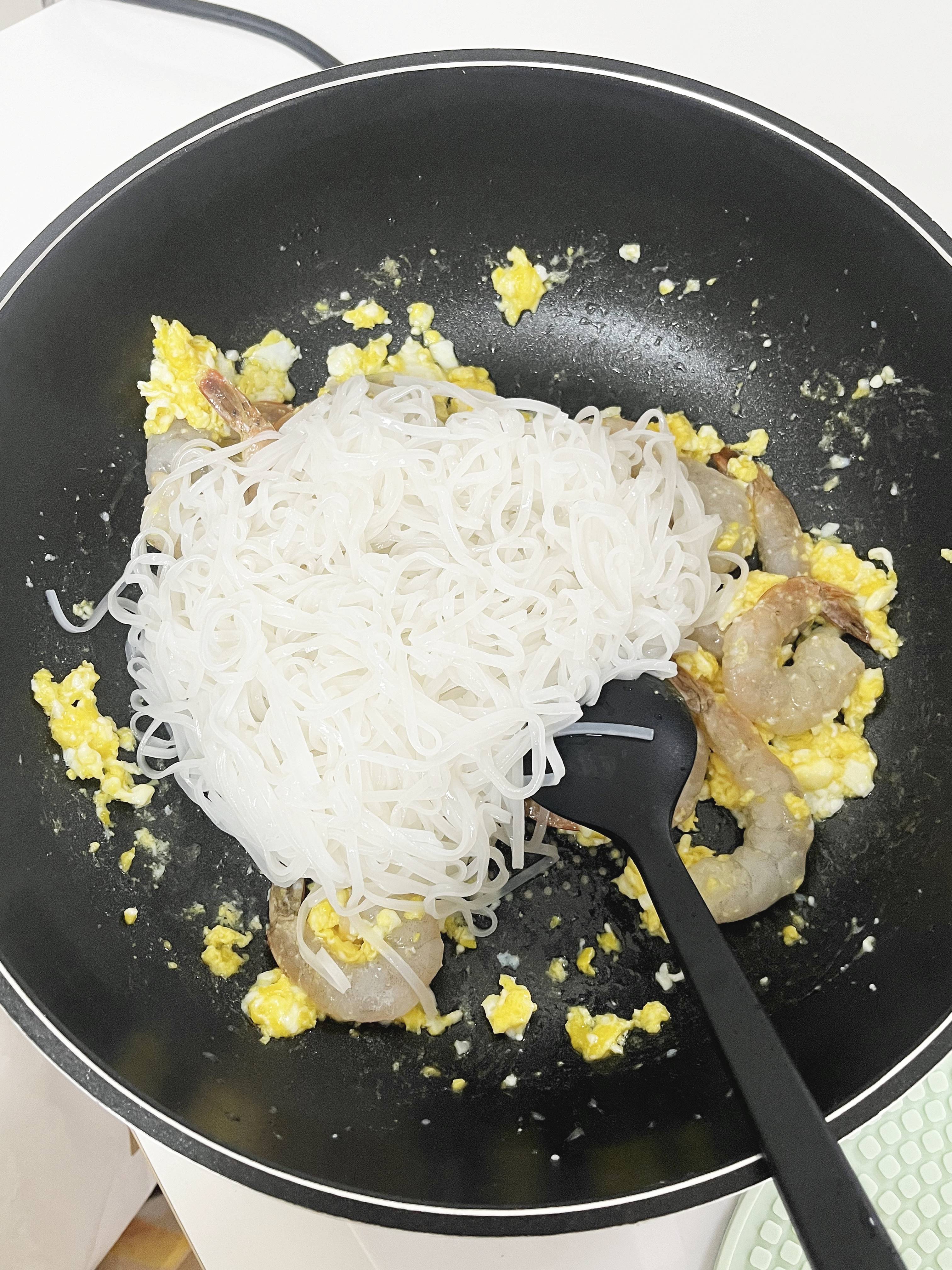 오일과 수란을 같이 볶아준 후, 그다음 새우도 넣어서 다시 익혀주었어요.