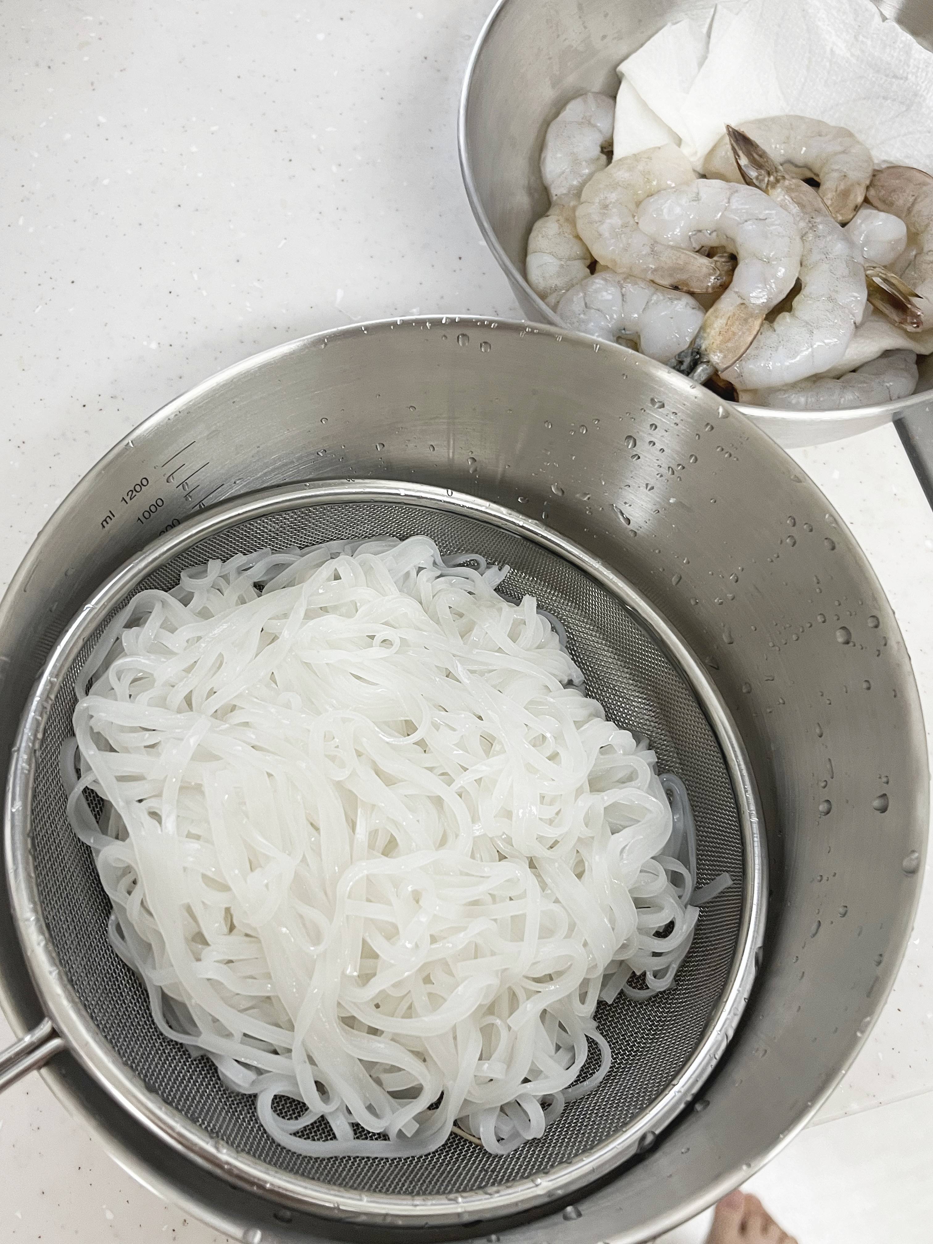 새우를 차가운 물로 씻어준 후, 키친타월로 물기를 제거해주었습니다. 그리고 끓는물에 면을 넣은 후 삶은 후 물기를 제거해주었습니다.