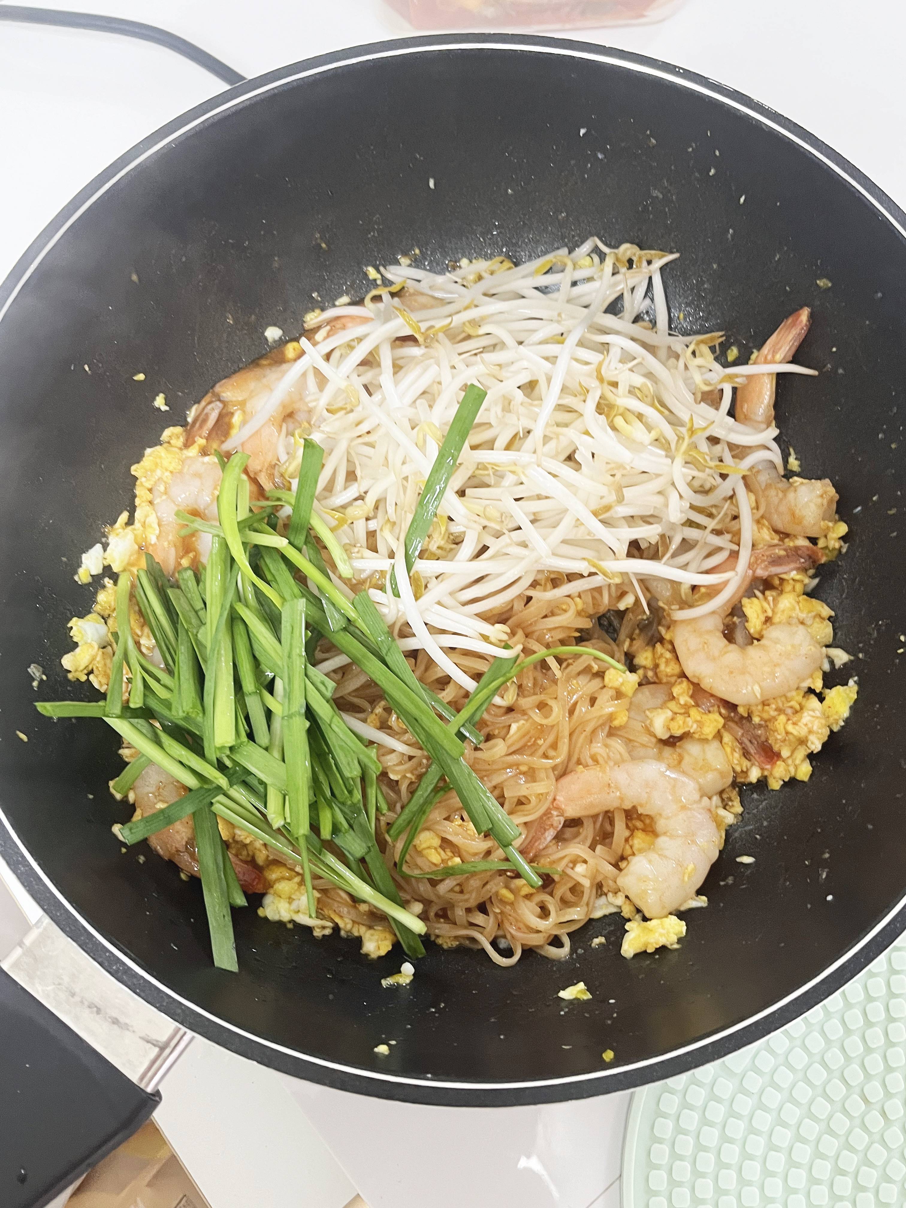 팬에 기름을 두르고 재료를 볶아주세요. - 소스 추가: 팟타이 소스를 추가하고